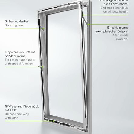 Schüco SimplySmart OpenSecure-beslaget for aluminiumsvinduer med vippe før dreie-betjening representerer vår nye løsning for økt sikkerhet. Den sikrer innbruddsmotstand opp til RC 2, ikke bare i lukket tilstand, men også i vippestilling. Dermed kan vinduet stå i standard vippestilling med inntil 175 mm åpning, sørge for god ventilasjon og fortsatt være innbruddshemmende.