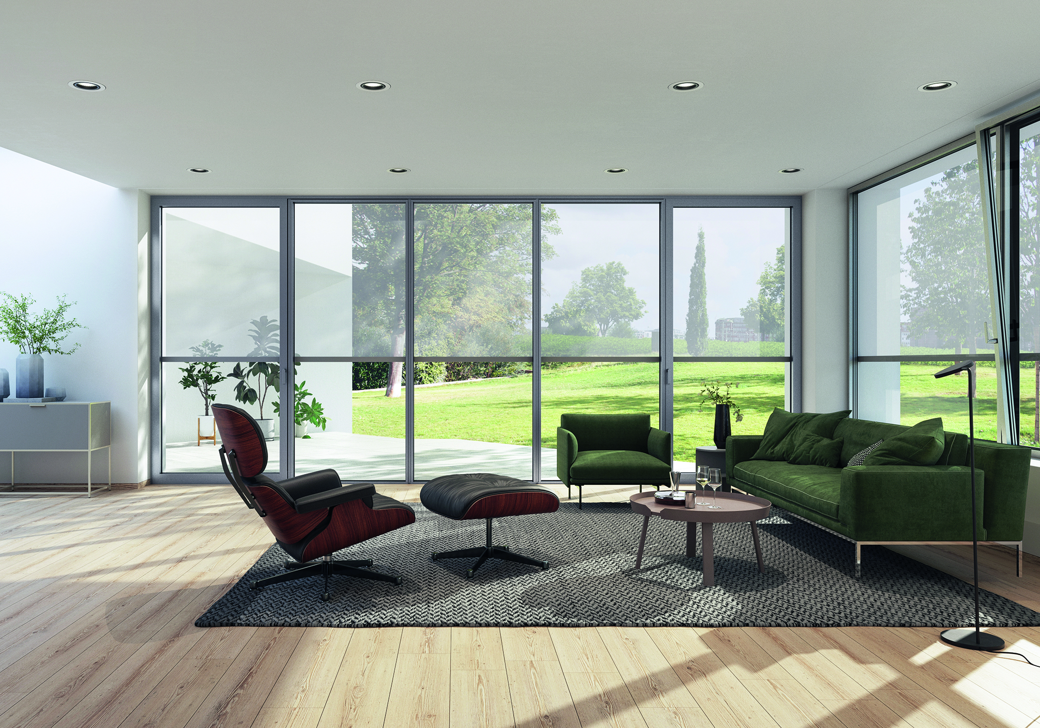 The internal sun shading combines glare protection, sun shading and thermal insulation in a single system, regardless of wind and weather.