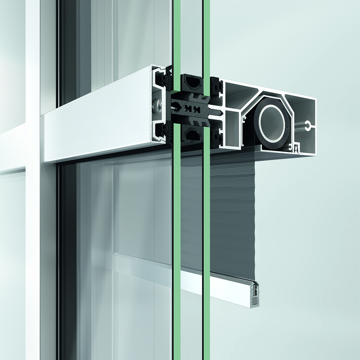 The pre-fabricated and insulated blind box of the ZDS sun shading system in AWS window systems is installed as a single unit together with the guide tracks.