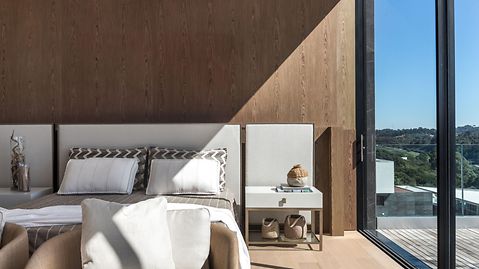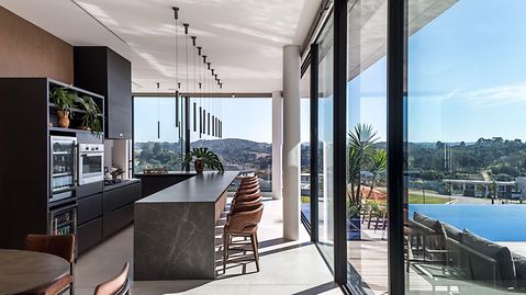 Conversely, the play of light and shadow created by the large pergolas finds its way into the interior and provides exciting vantage points. "The architecture is characterised by the play of volumes, which stand out from each other through the contrast of light and dark tones and different textures," describes Elaine Zanon. To give the modern building a natural character, the grained natural stone Gris Armani runs from the façade to the fireplace and into the bathroom. The contrast is provided by light natural tones, warm wooden floors and wall panelling, which the family wanted for a cosy living atmosphere. In the basement, there is space for a garage, an indoor garden and hobby rooms for making music and playing games. The highest priority, however, was given to the "Gourmet Area", which underlines the Brazilian attitude to life: the heart of the house combines kitchen, living and dining area - for relaxed living together, enjoyment and plenty of space to celebrate with friends and family. Of course with a flowing transition to the terrace. Here, summer evenings can be spent relaxing with a cocktail or cafézinho.