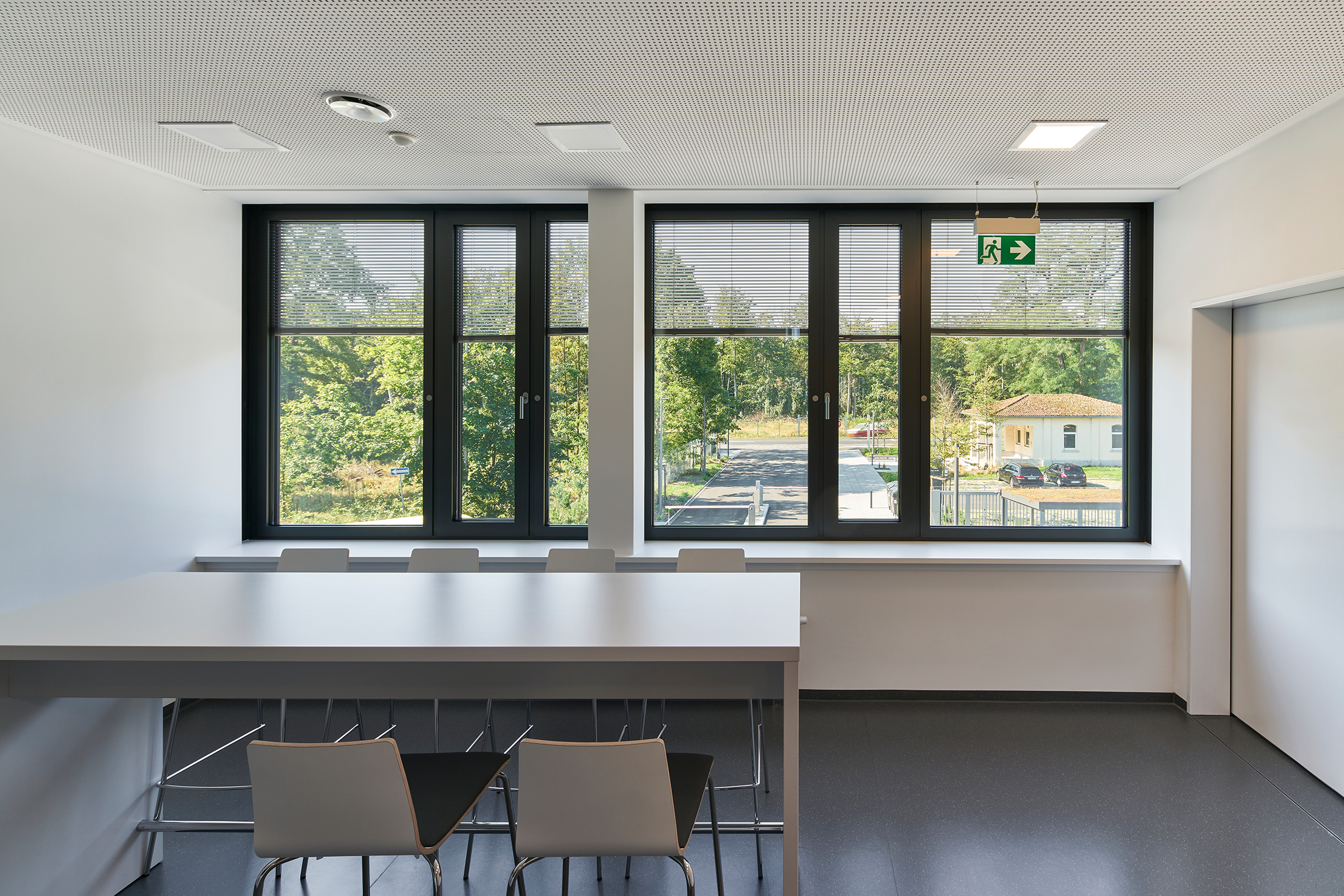 For the office spaces, the architects specified ribbon windows from the Schüco AWS 120 CC.SI system with integrated sun shading.