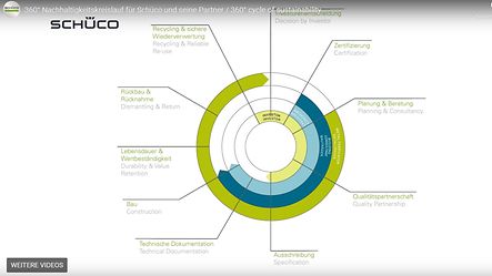 Esta forma de ver o ciclo deve também incluir no cálculo o conforto no local de trabalho e o elevado nível de produtividade dos colaboradores em zonas de trabalho com óptima ventilação, de forma a estabelecer critérios cruciais para a tomada de decisões. Isso inclui o trabalho que a Schüco realiza com o WWF (World Wildlife Fund) e a ASI (Aluminum Stewardship Initiative), a fim de examinar toda a cadeia de fornecimento de alumínio de acordo com critérios ecológicos e sociais. A Schüco apóia essas perspectivas orientadas para o valor para edifícios modernos com seu conceito abrangente de sustentabilidade 360 °.