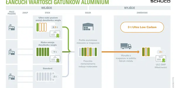 Dystrybucja profili Schüco Low Carbon (LC) i Ultra Low Carbon (ULC) jest organizowana zgodnie z tak zwaną procedurą kwotową. Koncentrujemy się na tym, aby zamówione profile docierały do miejsca przeznaczenia w sposób jak najbardziej efektywny i na krótkich trasach transportowych. Aby to zapewnić, w naszych procesach magazynowania i dostawy nie rozróżniamy między różnymi gatunkami standardowego aluminium, aluminium niskoemisyjnego i aluminium ultra niskoemisyjnego. Nie jest to nawet konieczne, ponieważ pod względem chemicznym, mechanicznym i geometrycznym gatunki materiałów są od siebie nie do odróżnienia.