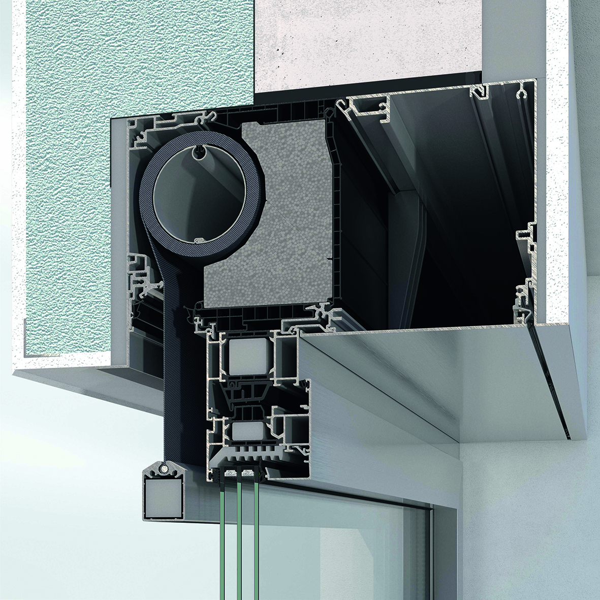 The pre-fabricated and insulated blind box of the ZDS sun shading system in AWS window systems is installed as a single unit together with the guide tracks.