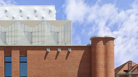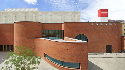 The new Volkstheater in Munich is an urban focal point on the site of Munich’s former slaughterhouse and stockyard, which is currently being developed to create a new district. As well as integrating an existing building, a prestigious newbuild was planned to continue the history of the site. As bricks dominated the appearance of the existing buildings, these were also the obvious choice of material for the newbuild. A courtyard with a large arch opening out towards the street is positioned between the old building, a narrow block on the northern side of the plot and the new foyer. The archway joins together the old and new buildings, providing clear access to the inner courtyard. The flowing building structure is a result of the functional requirements and, in addition to audience areas and three stages, it also houses rooms for modern stage technology, workshops and accommodation for the artists, as well as restaurants and offices.