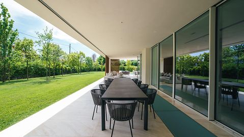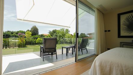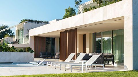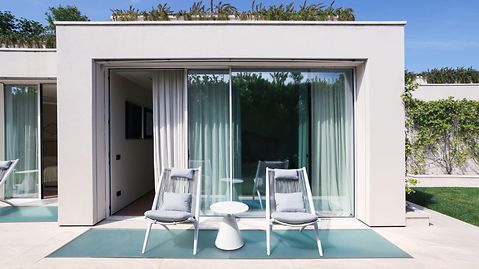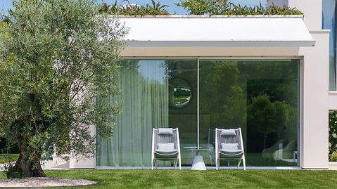 The living and garden areas are in constant dialogue. Large windows and Panorama Design sliding doors from Schüco support the architectural plans to create a clear relationship between inside and outside. Alongside the especially narrow profile face widths, the system also contributes the level-access threshold of the sliding doors, so that as much daylight as possible can enter the building.