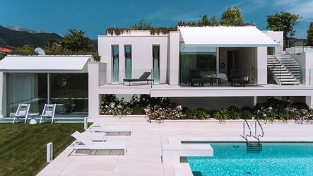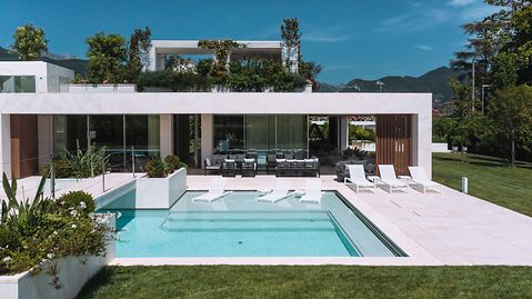 Antonio Tanzani planned a modern family home that reflected the owners and consists of only one floor which is, however, characterised by being over two levels. The living area is the most spacious part of the complex. The sleeping area features a series of right-angled clusters and consists of five suites. Both areas are located by a large pool with a sun deck over which a small bridge arches, which leads to the main, lakeside entrance.
