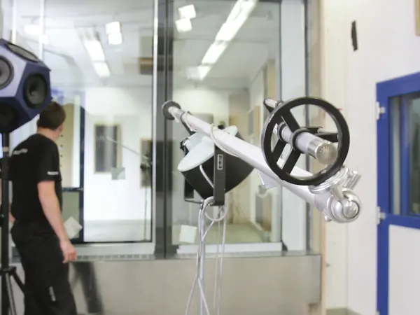 Zda zvuková izolace vůči vnějšímu hluku splňuje všechny požadavky, lze - především u složitých fasád - zjistit pouze laboratorním měřením. Navíc spolehlivá zvuková izolace mezi jednotlivými místnostmi může fungovat pouze tehdy, pokud je zabráněno přenosu zvuku vnější fasádou. Schüco dokáže v TC tyto vlastnosti na originálních konstrukčních prvcích přesně zkontrolovat. A pokud jsou zjištěny jakékoliv nedostatky, je určena jejich příčina a příslušný konstrukční prvek je pak na tomto základě adekvátně optimalizován. To je např. zvláště důležité u zvukotěsné izolace flexibilních systémů dělících příček v kancelářských budovách. Protože i po přestavbě interiéru by měla být, zejména v takto důvěrné oblasti, zachována odpovídající zvuková izolace. Pro realistická měření v oblasti stavební akustiky jsou k dispozici čtyři oddělené prostory, které jsou také akusticky separovány od vibrací zbytku TC.