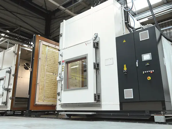 Zcela nová je diferenční klimatická komora pro stavební prvky a kompletní elementy o velikosti až 3.000 x 3.000 mm. V tomto speciálním zařízení, které bylo zbudováno na zakázku Schüco, jsou simulovány teplotní a vlhkostní rozdíly mezi vnitřním a venkovním prostředím. Díky tomu lze za různých (někdy až extrémních) klimatických podmínek testovat i objemné stavební komponenty.