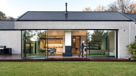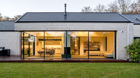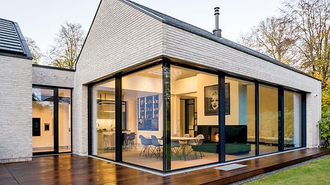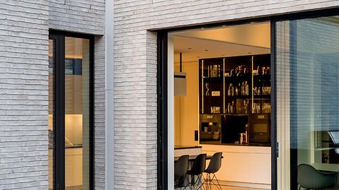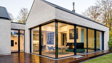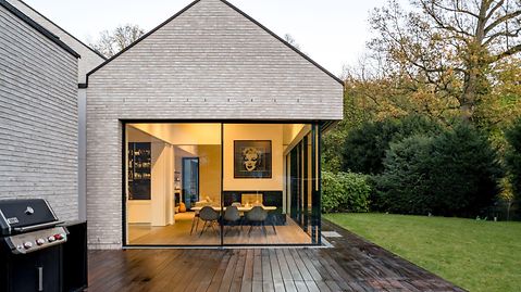 The core idea running through the design was the harmonious connection of the house and nature. Through flowing transitions between inside and outside, the aim was to enable the established trees to be experienced at all times. The house therefore appears modest from the street, but opens out fully onto the garden. This is achieved primarily by a Panorama Design sliding door which forms a glass front measuring three metres high by two metres wide and, thanks to a level threshold, provides barrier-free access.