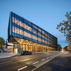 Im krassen Gegensatz dazu steht die Stringenz der Fassade, deren geometrische Form durch vorgehängte vertikale Glasschwerter noch zusätzlich verstärkt wird. Die außen an die Glasfassade des Schüco Fassadensystem-Klassikers FWS 50 angebrachten Glasbalken mit Punktbedruckung rhythmisieren die beiden Längsfassaden und dienen den dahinter liegenden Büros als zusätzlicher Sonnenschutz. Darüber hinaus wurde der außen liegende Sonnenschutz CTB in die Schüco Fassade FWS 50 integriert. Die Glasfassade gibt für Passanten den Blick auf die organischen Innenräume und die offene Holzkonstruktion des Gebäudes frei, so dass die verschiedenen Stilrichtungen und Symboliken – stark, wehrhaft und diszipliniert außen; dynamisch, einladend und nachhaltig innen – erlebbar werden.