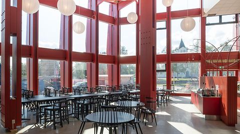 In der Bergbaustadt Gällivare im schwedischen Lappland entsteht mit dem Kunskapshuset (Haus des Wissens) ein wichtiger Baustein für einen wirtschaftlich, ökologisch und sozial nachhaltigen, funktionalen und architektonisch attraktiven Komplex. 850 Schüler:innen der gymnasialen Oberstufe und eine Einrichtung der Erwachsenenbildung haben Platz in dem sechsgeschossigen, terrassierten Neubau, der Versatzstücke der traditionellen schwedischen Architektur zu einem expressiven Ganzen zusammenfügt. Die rote Fassade des Gebäudes ist inspiriert von den Farben der nahen Natur. Das äußerlich markanteste Merkmal sind die übergroßen, außen liegenden Fassadenpfosten aus Leimholz. Paarweise angeordnet und sägezahnartig profiliert, gliedern sie die Ansichten des Gebäudes in der Vertikalen und der Horizontalen. In den Konferenzräumen im Dachgeschoss, der Kantine im Erdgeschoss und der eindrucksvollen fünfgeschossigen Eingangshalle kehren Elemente des Außen-baus auch im Inneren wieder (Janisol 2, Janisol C4, Economy 60, Janisol, AWS 75.SI).