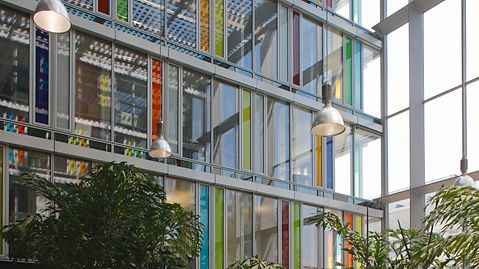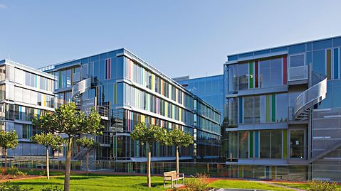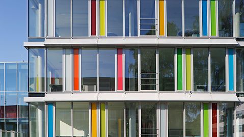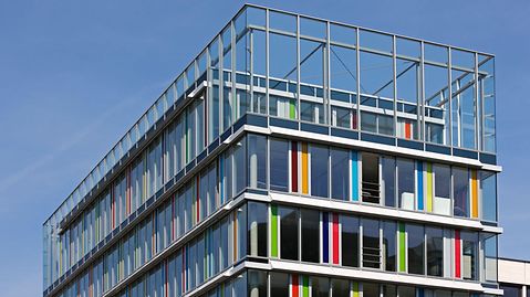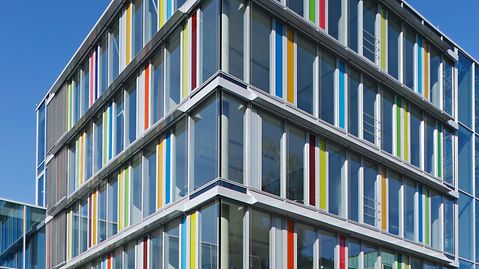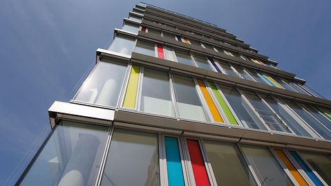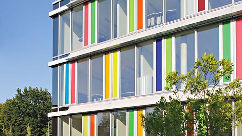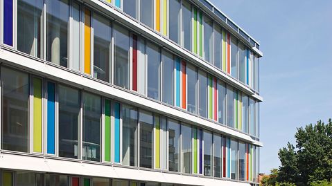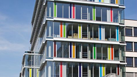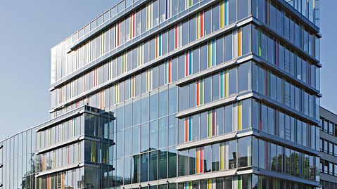 Das neue Verwaltungsgebäude der LVM-Versicherung in Münster präsentiert sich zur Straße mit einer durchgängigen Glasfassade. Transluzente, farbige Glasfelder geben der Fassade eine heitere, emotionale Note.