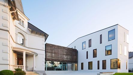 Die traditionsreiche Schokoladenfabrik Weinrich produziert bereits seit 1895 mitten in der Stadt Herford Schokolade. Nun wurde die zweigeschossige Gründerzeitvilla um ein neues Bürogebäude erweitert, welches durch ein Glasgelenk an die Villa angeschlossen ist. Alt und Neu treten in einen Dialog: hier die Villenfassade mit kleinen Öffnungen, dort der glatte Büroriegel – hier symmetrisch angeordnete Fenster in tiefen Laibungen, dort großflächige, flächenbündig versetzte Glasflächen. Schokofarbende, gelochte Blechelemente werden als prägendes Gestaltungselement für die Verkleidung des auskragenden Konferenzraums im gläsernen Zwischenbau verwendet und formen sich zu einem semitransparenten »Schokoblock« über dem glitzernden Haupteingang aus verbeultem Edelstahlblech als Anspielung auf Schokoladenpapier.