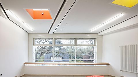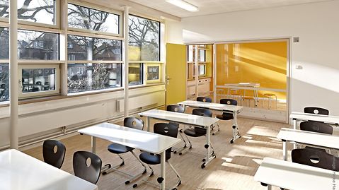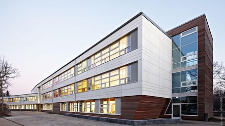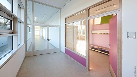 Die Grundschule Klein Flottbeker Weg liegt im grünen, von altem Baumbestand geprägten Hamburger Stadtteil Othmarschen. Für die in den 1970er- und 1980er- Jahren entstandene Pavillonschule sollte Ersatz geschaffen werden. Den hierfür ausgeschriebenen Wettbewerb, der Räume für 300 Schüler und 25 Lehrkräfte sowie eine Dreifeldsporthalle forderte, konnte das Hamburger Büro Trapez Architektur für sich entscheiden. Die städtebauliche Integration des Gebäudes gelingt durch eine Gliederung in drei maximal dreistöckige Gebäudetrakte und eine feinteilig gestaltete Fassade. Als erste Schule Hamburgs verfügt der Neubau über eine CO2-neutrale Energiebilanz: Das Energiekonzept des Gebäudes setzt auf eine kompakte Bauweise sowie eine hochgedämmte, wärmebrückenfreie und dem Passivhausstandard entsprechende Hülle. Der minimierte Energiebedarf des Gebäudes wird vollständig durch erneuerbare Energiequellen gedeckt. Zur positiven Energiebilanz trägt außerdem die optimierte Tageslichtausnutzung mit Fensterflächen in Pfosten-Riegel-Konstruktion und Dreifachverglasung bei, die sich im Bereich des Haupteingangs über alle drei Geschosse erstreckt. Hier kommt das lasergeschweißte Stahlprofil Jansen VISS Ixtra zum Einsatz, das für die Gestaltung großer Spannflächen prädestiniert ist und das die Architekten aufgrund seiner schlanken Pfosten wählten. Im Bereich der Treppenhäuser findet das Jansen Profil VISS Anwendung. Die Abkürzung VISS steht dabei für voll isoliertes Sprossen-System. Diese Profile bieten ebenso wie VISS Ixtra die Möglichkeit, Dreifachverglasung aufzunehmen, und eignen sich für die Verwendung in Passivhausbauten. Im Gegensatz zum klassischen Passivhaus kann die Grundschule Klein Flottbeker Weg jedoch natürlich belüftet werden. Vor der Schule befindet sich eine großzügige Übergangs- und Ankunftszone. Das Foyer, das man über den Haupteingang betritt, fungiert als kommunikatives Zentrum: Ein offener Treppenraum mit Sitzstufen lädt zum Verweilen ein.