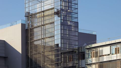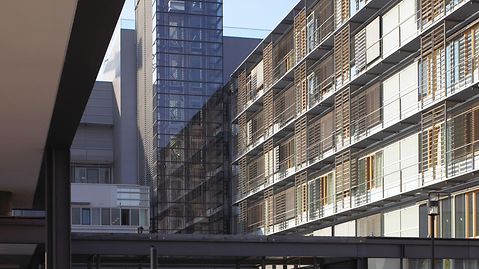 Die Anlage des Robert-Bosch-Krankenhauses in Stuttgart aus den 1970er-Jahren wurde seit 1992 in diversen Bauabschnitten und Umbaumaßnahmen erweitert. Neben verschiedenen Neubauten wurde der gesamte Komplex zwischen 2000 und 2007 bei laufendem Betrieb saniert. Das Krankenhaus, das Platz für 521 Patienten bietet, wurde dabei in 38 Einzelbaustellen modernisiert. Neben der Optimierung der Prozesse und des Raumangebots wurde das Gebäude energetisch durch neue Fassaden modernisiert. Anstelle der bisherigen Waschbetonfassaden besteht die neue Gebäudehülle nun aus einer filigranen Konstruktion aus Metall, Holz und Glas. Auch im Innenraum wurden alle Oberflächen wie Wände, Decken, Böden und Verkleidung erneuert und mit hellen, freundlichen Materialien gestaltet. Das Gebäude wird über einen transparenten und übersichtlichen Eingangsbereich betreten, an den drei gläserne Pavillons angeschlossen sind, die auch von außen besonders ins Auge fallen. Darin sind ein Café, die Patientenaufnahme und ein Raum für Veranstaltungen untergebracht. An das Foyer ist ein gläsernes Treppenhaus mit zwei Panoramaaufzügen angebunden, die die vier Stationsflügel erschließen und bis zur Dachterrasse führen.