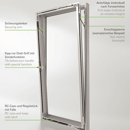 Damit Einbruchhemmung in RC 2 nicht nur beim geschlossenen Fenster, sondern auch in Kippstellung möglich ist, weist der Beschlag fünf Sicherheitskomponenten auf. Sicherungslenker sichern das Fenster in geöffneter Kippstellung, Anschläge regulieren die Öffnungsweite, Einschlagsterne sichern offene Schraubenköpfe und verhindern damit Manipulationsversuche, und die Kombination aus einem RC-Case und einem Riegelstück mit Falle sichert das gekippte Fenster im unteren Bereich. Wichtiger Tipp: Der Versicherung melden, dass das Gebäude mit Fenstern ausgestattet ist, die Einbruchhemmung bis Widerstandsklasse RC 2 auch in Kippstellung bieten.