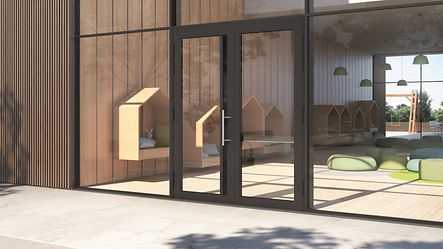 Die Schüco DCS Kindergartenlösung ermöglicht kindersichere Austrittskontrolle. Bei einem Öffnungsversuch über den Türgriff bleibt das Türsystem verschlossen.