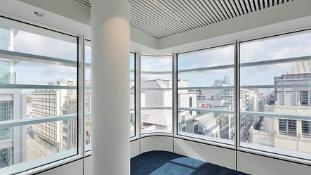 Das vom Architekturbüro ArtBuild Architects geplante Belnine verbindet an der Adresse Rue Belliard 9 seit seiner Fertigstellung 2022 die Straßen Rue Belliard und der Rue du Commerce miteinander. Das Eckgebäude mitten im europäischen Zentrum der belgischen Hauptstadt ist dabei ein echter Blickfang und erzeugt durch geschwungene Lamellen an der Fassade kontrastreiche Tiefen und Höhen in der Außenansicht. Innen dienen die Lamellen der Verschattung in den ansonsten lichtdurchfluteten Büroräumen. Bei genauerer Betrachtung fallen die schmalen Ansichtsbreiten und die dünne Verglasung der Fassade auf. Denn das Belliard 9 ist durch den Einsatz einer Hybridverglasung mit Vakuumglas in technischer Hinsicht eine echte Innovation. Der Gebrauch von FINEO Vakuumglas in Schüco Elementen ermöglicht einen reduzierten Materialaufwand bei gleichzeitig hervorragenden Dämmwerten.