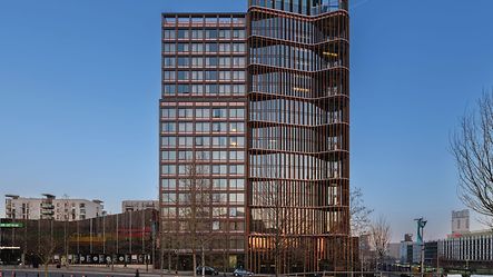 Die schlanken vertikalen Lamellen der Hotelfassade bilden ein Gegengewicht zu den gebogenen horizontalen Elementen und erinnern an Eisenbahnlinien. Das kommt nicht von Ungefähr: 1840 bis 1991 befanden sich auf dem Gelände die Stratford Works, das Lokomotivenbauwerk der Great Eastern Railway. Realisiert wurde die auffällige Fassadengestaltung mit einer maßgeschneiderten Sonderkonstruktion, basierend auf der Schüco Elementfassade USC 65.