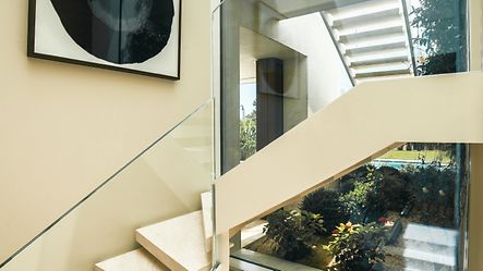 Wohn- und Gartenbereich stehen in stetigem Dialog: Großflächige Fenster und Panorama Design Schiebetüren von Schüco unterstützen das architektonische Vorhaben, eine klare Beziehung zwischen Innen und Außen herzustellen. Neben den besonders schmalen Profilansichten der Systeme trägt auch die bodengleiche Schwelle der Schiebetüren dazu bei, dass ein Maximum an Tageslicht in das Gebäude fällt.