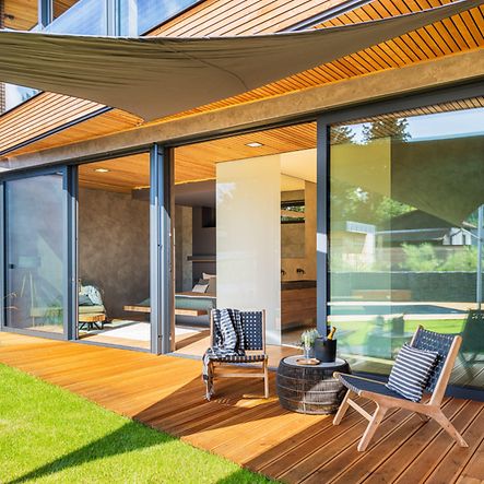 Die gesamte untere und obere Fassade des Hauses zum Garten hin ist reich verglast: Neben lichtdurchfluteten Räumen sorgen die großformatigen Schüco Fenster- und Türsysteme für eine energieeffiziente Gebäudehülle. Das Cradle-to-Cradle-zertifizierte Fenstersystem AWS 75.SI punktet ebenso wie das Türsystem ADS 75.SI mit herausragenden Wärmedämmwerten. Die hochwärmegedämmten Klassik Design Schiebetüren ermöglichen im offenen wie auch im geschlossenen Zustand einen perfekten Außenbezug.