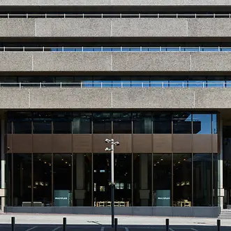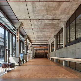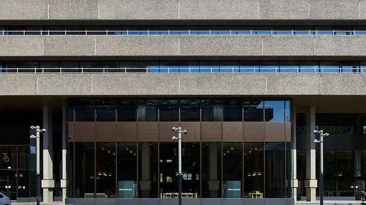 Among the most significant cultural establishments on the South Bank area on the southern banks of the River Thames is the National Theatre, constructed in 1976 in line with architect Denys Lasdun's design. In 1983, Lasdun completed his vision on the neighbouring with the construction of the IBM Marketing Centre. The two buildings impress as a late Brutalist ensemble with balanced symmetry, horizontal lines, rough exposed concrete surfaces and imposing concrete structures. To prevent its partial demolition after IBM moved out, the City of London granted the former IBM building listed status in 2020, as it had the National Theatre in 1994. The architectural practice AHMM revised its conversion concept and promised the retention of 80% of the original fabric of the building.