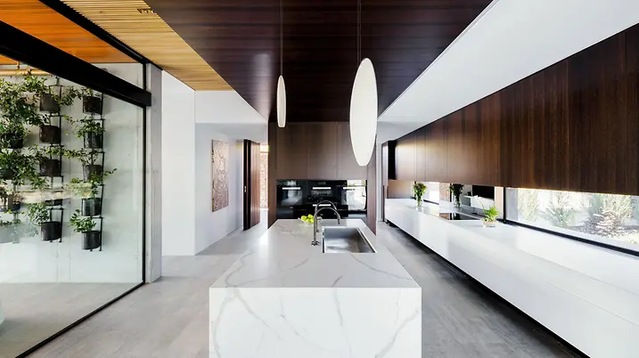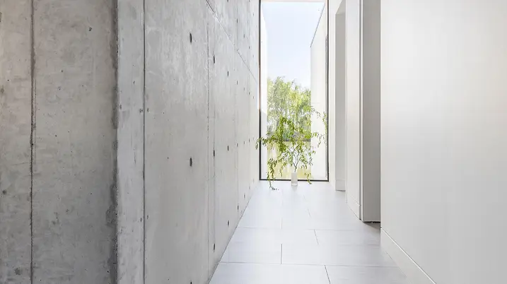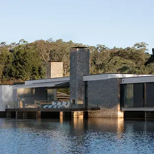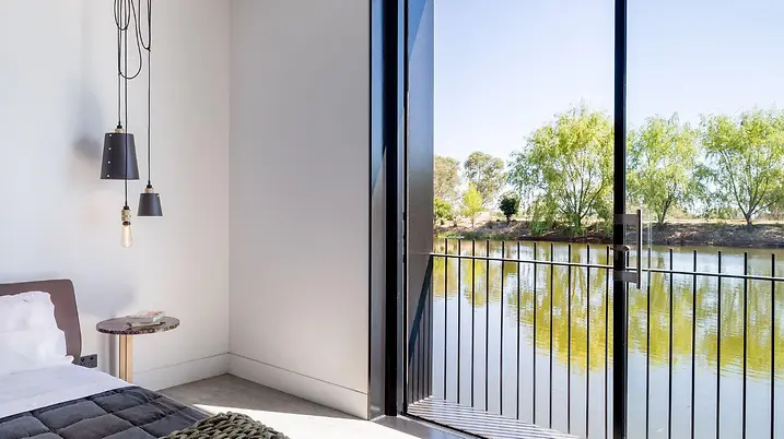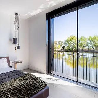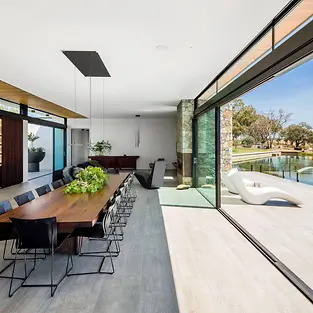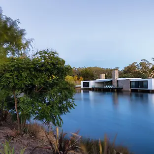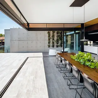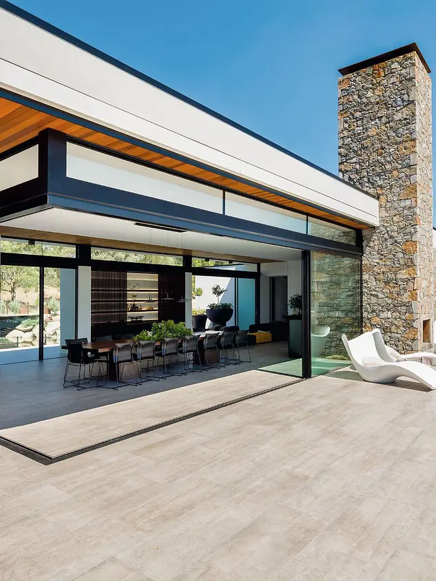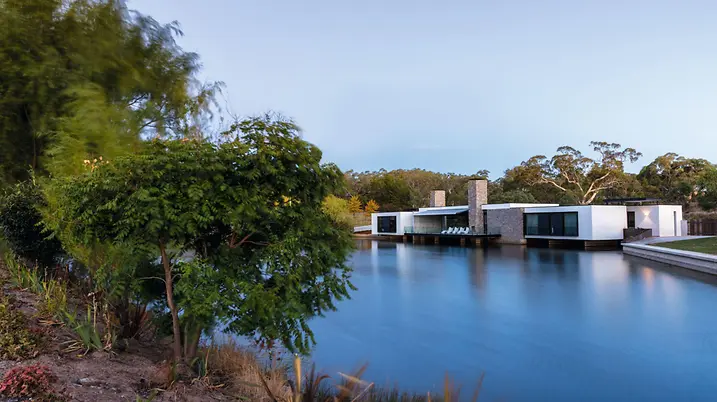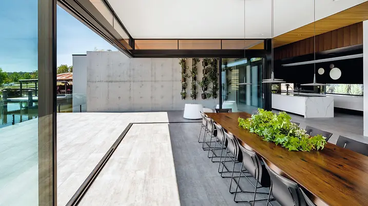 The house designed in the style of a bungalow sits elegantly at the side of a dam and gives the impression that it is floating on the water. Inside, the seamlessly connected living, cooking and dining areas form the heart of the house. A Panorama Design sliding door can be completely opened up at the corner onto the bridge-like terrace outside, offering fantastic views.