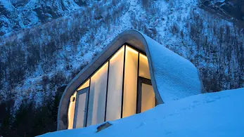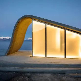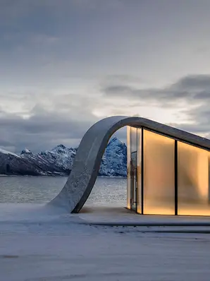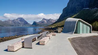 Amid the impressive Nordland landscape, the Uredd Rest Area combines spectacular views with an innovative design. Not only can visitors marvel at the Northern Lights and midnight sun, but they can also discover a special architectural feature in the form of an unusually designed toilet facility block, which is perfectly integrated into the harsh coastal landscape.