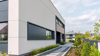 While the design of the building structure is based on straight lines, the surface textures of the façade are combined in very different ways. The striking aluminium panels of the roof cladding, the black frame of the pergola and the profiles of the window and sliding systems create a stark contrast to the white plaster. Timber-clad units break up these striking oppositions and lend the building a natural touch.