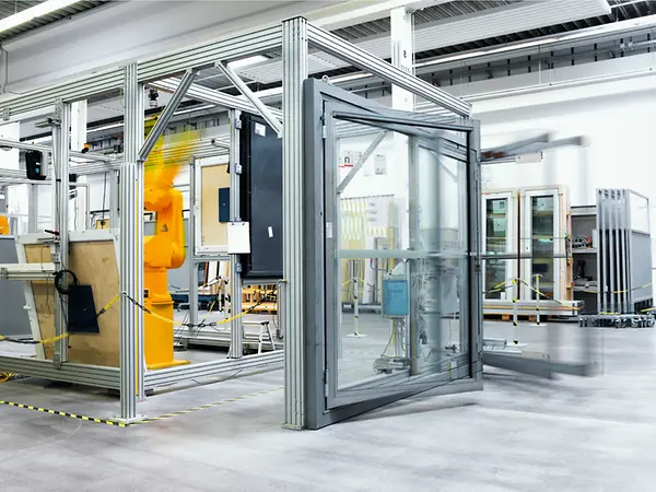 In the second test laboratory, air permeability, driving rain tightness, resistance to wind load and operating forces can be tested. Pre-approval tests of the elements and development support for new systems are also part of the repertoire. The Test and Training Center (TTC) offers a complete state-of-the-art production line for PVC-U systems, where Schüco technicians and customers are trained under real conditions.