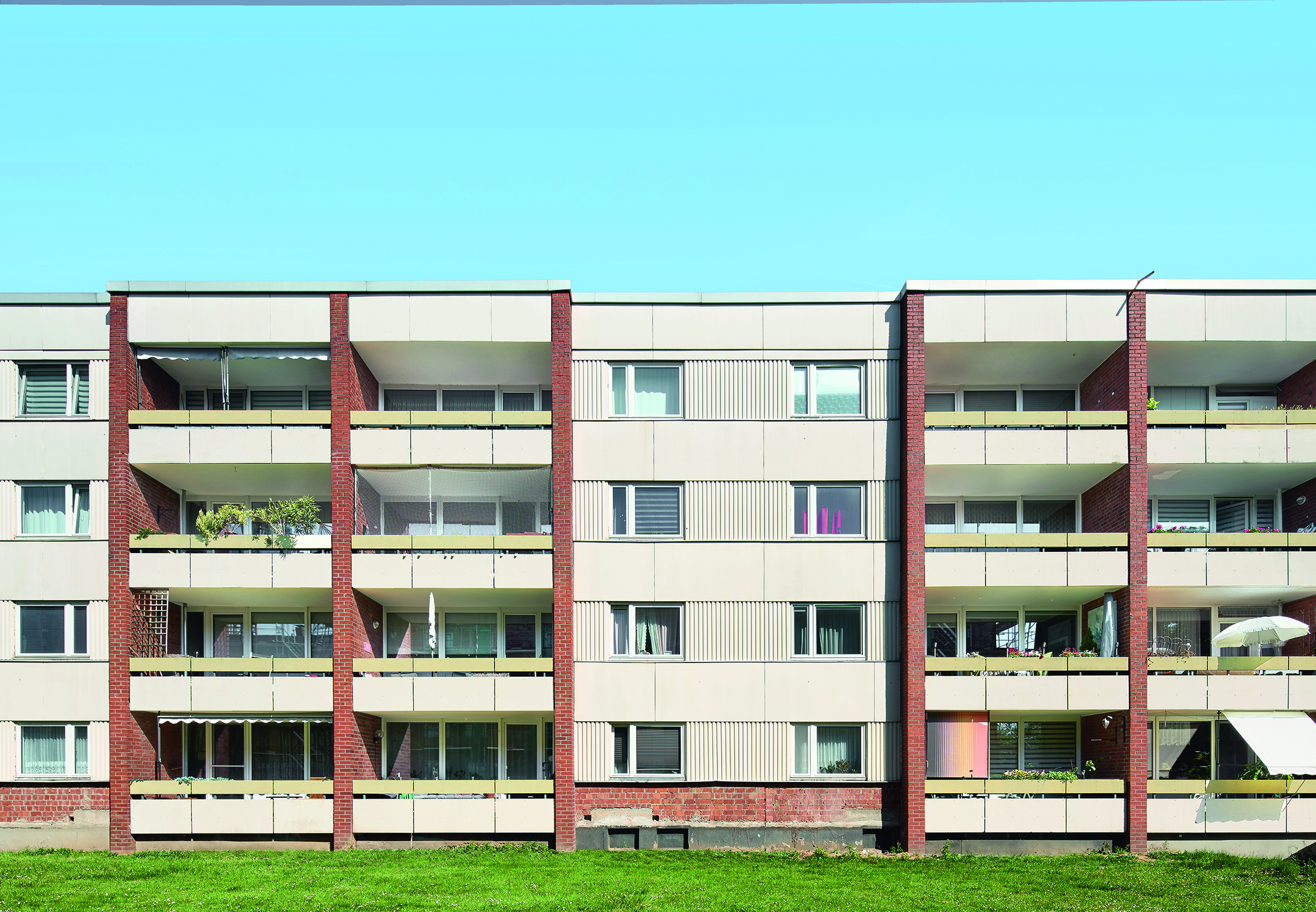 In Düsseldorf's Corelli Quarter, 140 apartments are being renovated in series. The building in the centre of the image is already complete; the one directly to the right of it is under construction. The one to the far right shows how they looked pre-renovation.