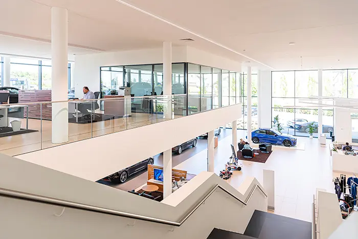 Employees can always see the showroom from their desks too thanks to the interior windows made from the VISS steel profile system.