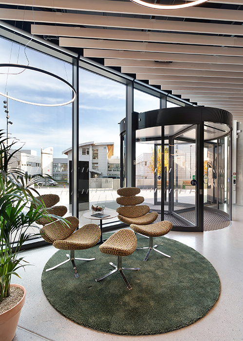 On the entrance side, which adorns a distinctive indent in the building’s profile, the Schüco FWS 50 SG.SI façade system demonstrated maximum design freedom combined with the best possible environmental sustainability.