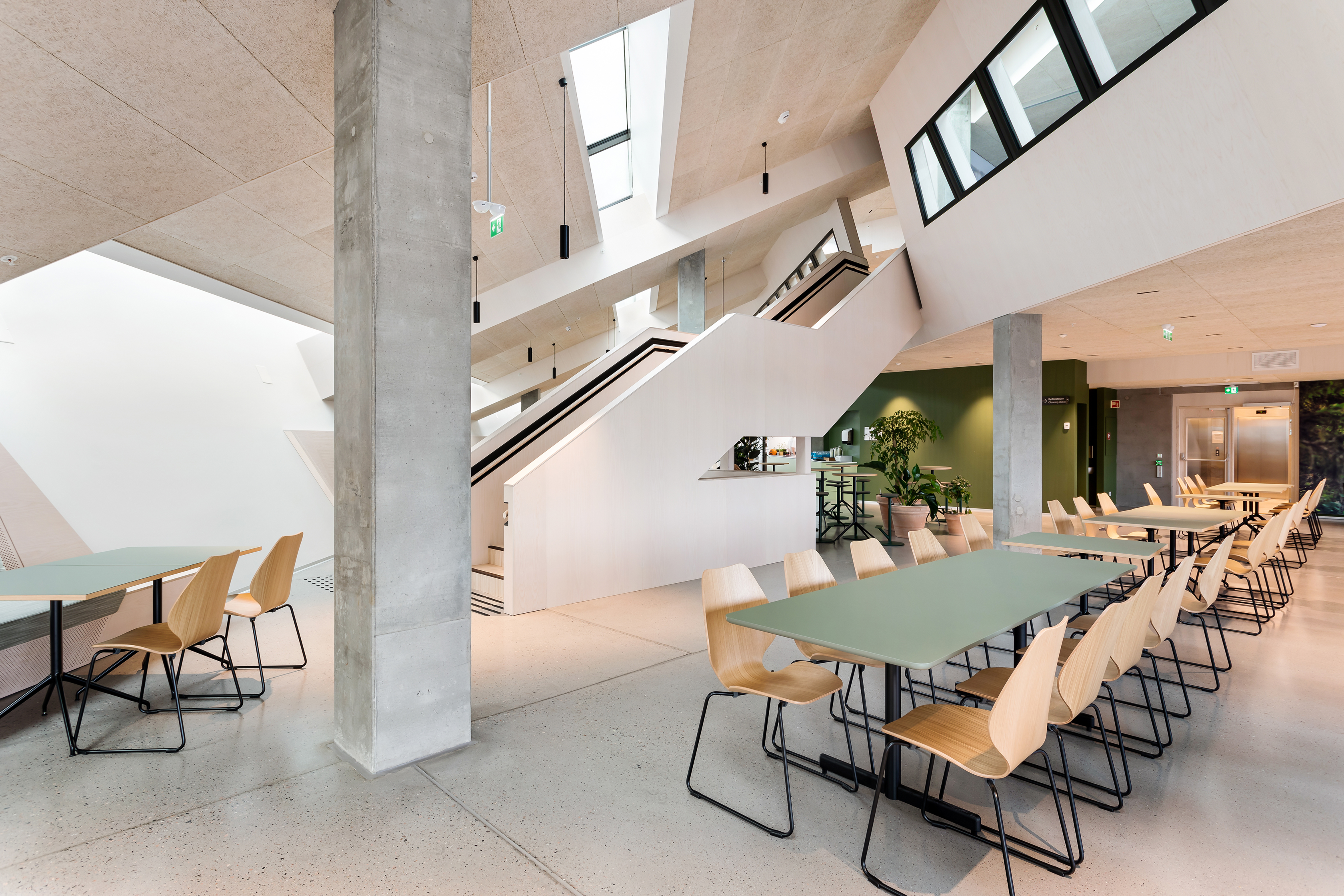 On the ninth floor, a striking staircase connects the canteen to the conference rooms. This not only invites you to take the stairs and improve your circulation, it also encourages chance encounters and thereby communication between users.