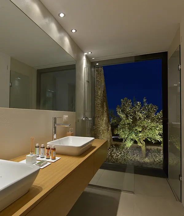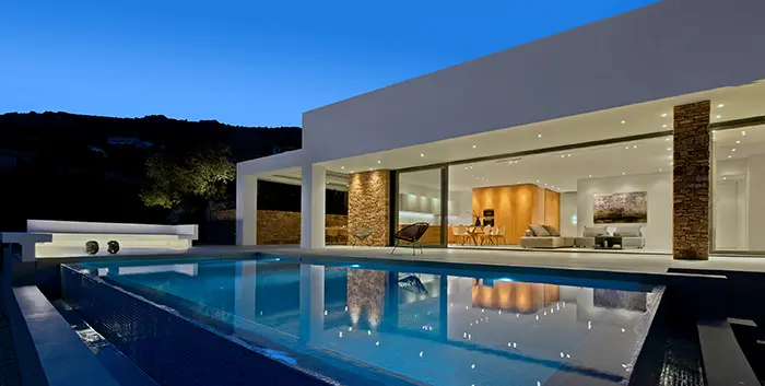 Bielefeld. In the Greek town of Tolo nestled among the Peloponnese mountains and with a view of the Argolic Gulf lies Villa NafplioBlu, both the private summer residence of the client and a luxury holiday rental. In her architectural concept, Athens-based architect Katerina Valsamaki emphasised the importance of carefully integrating the building into the natural environment and having an “open dialogue” with the panoramic coastal views. Generous light openings, constructed with window and sliding systems from Schüco, allow the natural surroundings to be experienced throughout the house.