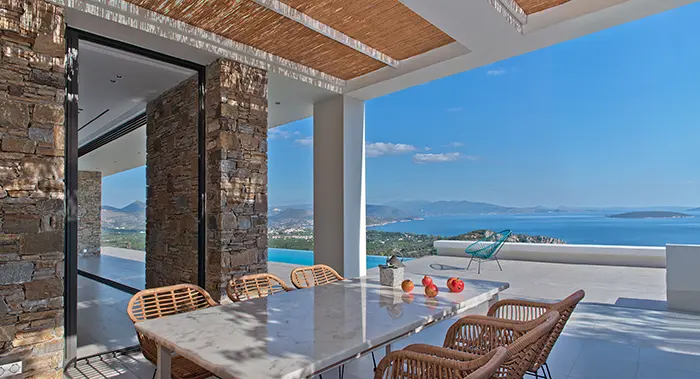 Panoramic view of Tolo Bay and the Argolic Gulf: the architecture of Villa NafplioBlu takes full advantage of the natural and topographical features of the spectacular plot.
