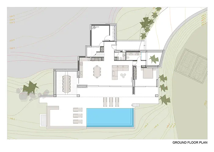 A floor-to-ceiling sliding system measuring approx. 9.00 m wide by 2.90 m high (Schüco ASS 50) provides direct access from the interior living/dining area to the pool and terrace.