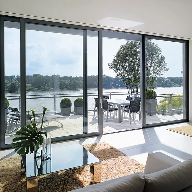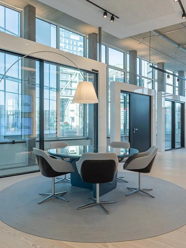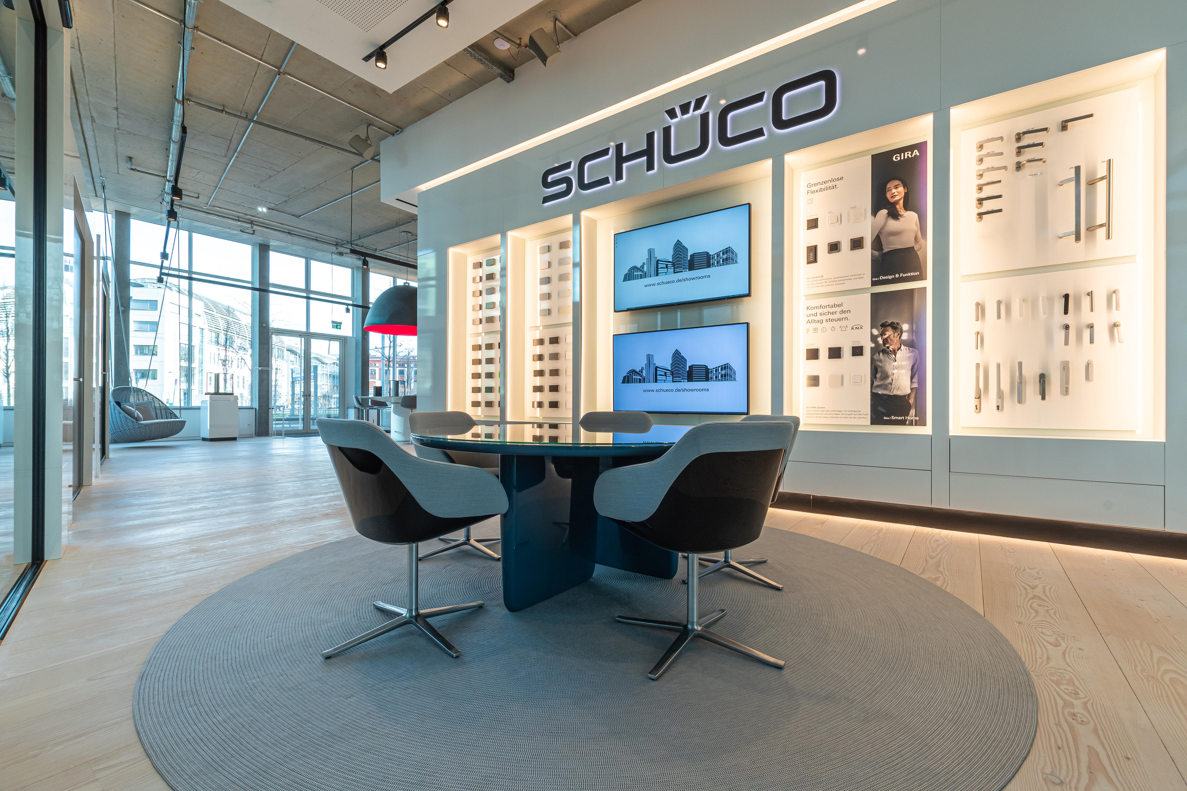 The showroom lies at the centre of the Medienhafen in Düsseldorf. Located on the ground floor of the FLOAT building, the re-designed showroom showcases large exhibits made from aluminium. The Medienhafen is one of Düsseldorf's top spots for architecture and is home to many prestigious buildings which feature Schüco products.Visitors can explore the wide variety of samples from our different product areas, such as sliding systems, window, door and façade systems, and fire protection and sun shading systems. Our lounge area with an espresso bar is where we welcome you and your customers for individual design meetings and consultations. Training sessions, seminars and larger events are held in a dedicated conference space in the showroom. Languages: German, English, Italian and Spanish