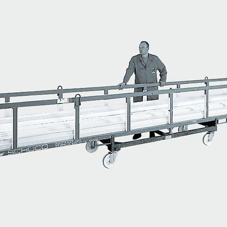Long profile pallets up to 760 millimetres wide are transported easily, quickly and safely on the robust welded steel construction of the transport trolley.
