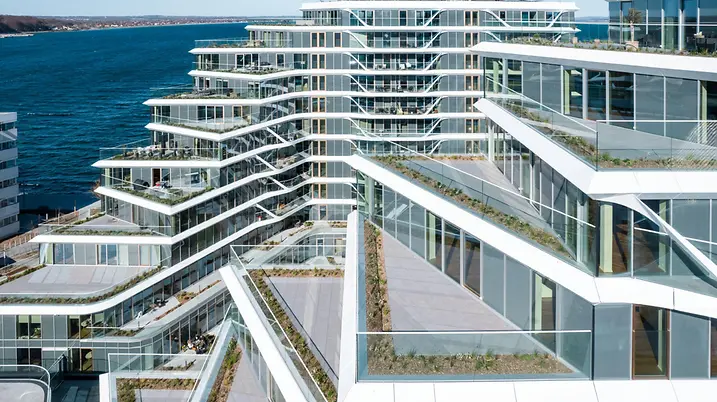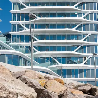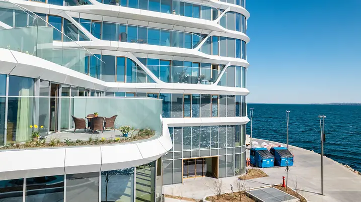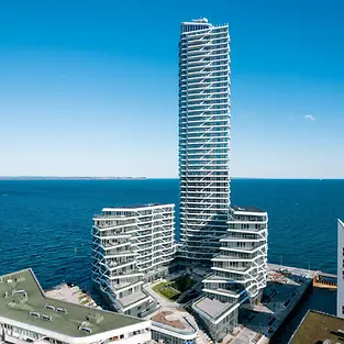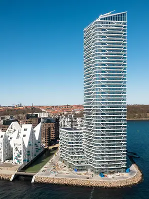 The residential tower at the top of the harbour city of Aarhus rises into the air to an impressive height of 142 metres. It is the tallest residential building in Denmark and a part of the Lighthouse project. With more than 380 apartments across 44 floors, the tower offers living spaces with breath-taking views.