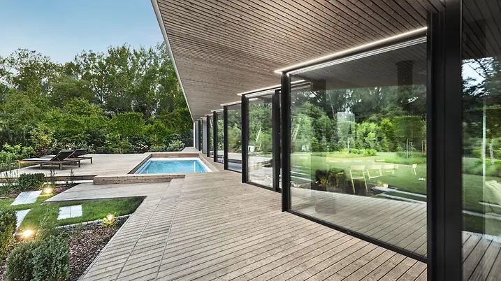 The Triangle House makes optimal use of the trapezoidal site for an extraordinary architectural concept. The windows and sliding doors are especially noteworthy, arranged at precise angles to provide the most impressive views of the plot. Positioned facing the west and south, the property offers impressive panoramic views and generous amounts of natural light.