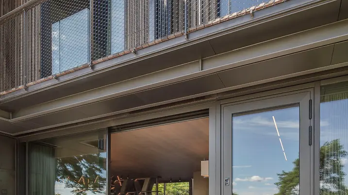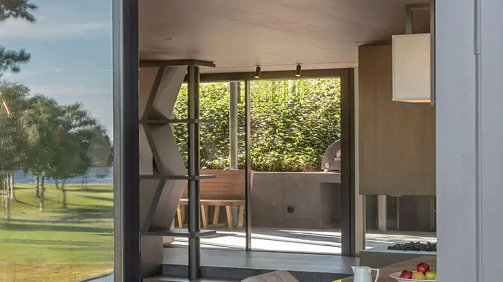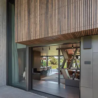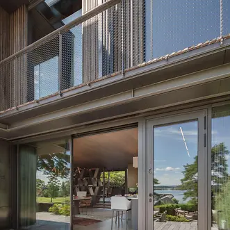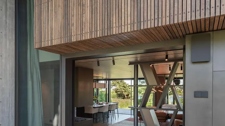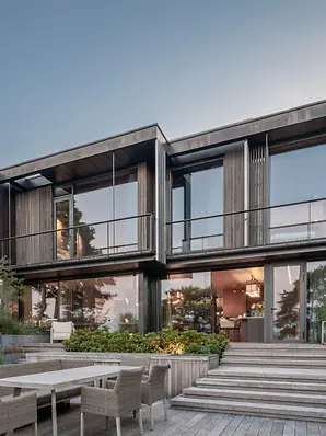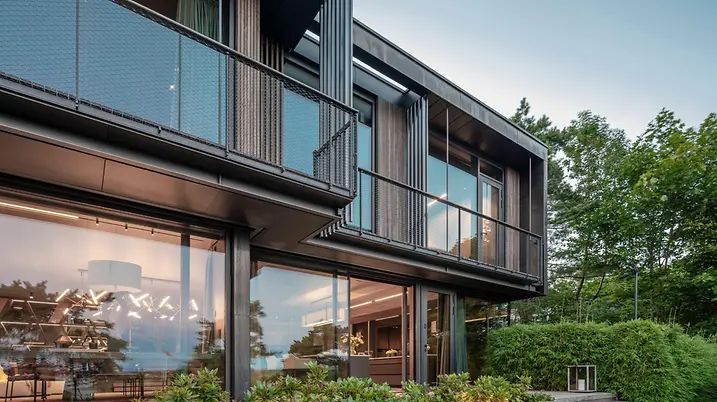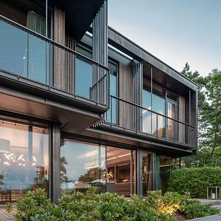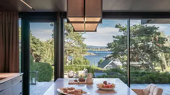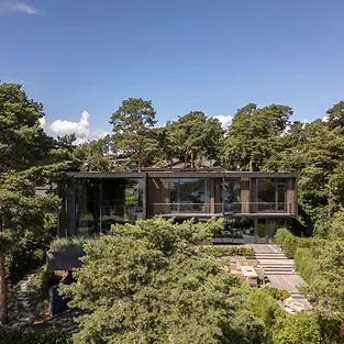 The client dreamed of a house with generous use of glass, exposed concrete and oak wood, positioned on a hillside plot of land on the Oslo fjord and surrounded by old trees that absolutely had to be preserved. The result is a modern villa that allows plenty of natural light to enter through the generous glazing and, at the same time, provides remarkable views of the surrounding landscape.
