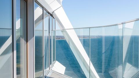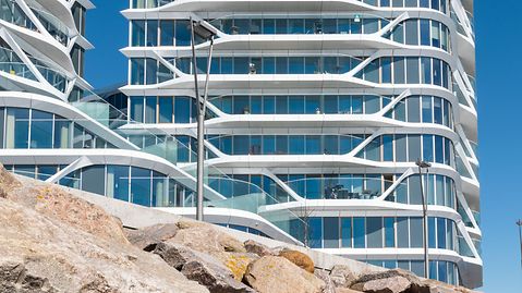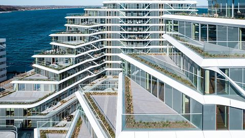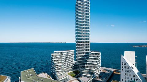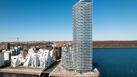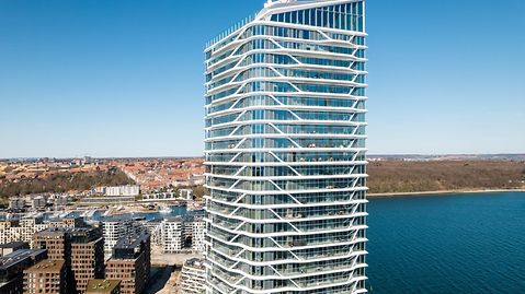 The residential tower at the top of the harbour city of Aarhus rises into the air to an impressive height of 142 metres. It is the tallest residential building in Denmark and a part of the Lighthouse project. With more than 380 apartments across 44 floors, the tower offers living spaces with breath-taking views.