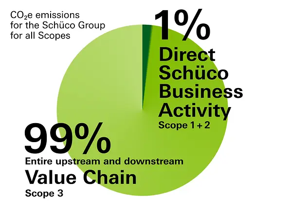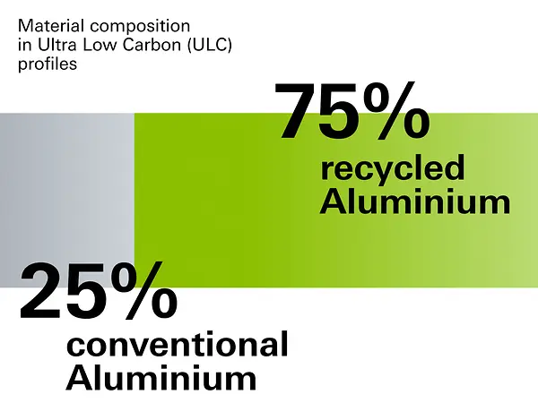 The measures that we have introduced are already showing initial signs of success. We have been able to significantly lower the carbon footprint of our material grades by increasing our use of green energy and recycled materials. This has enabled the Global Warming Potential (GWP) of the Schüco Low Carbon (LC) aluminium profiles to decrease from 4.14 kg of CO₂e per kilogram of profile to 3.84 kg of CO₂e. For our Ultra Low Carbon (ULC) profiles, we were able to reduce the GWP value from 2.27 to 1.99 kg of CO₂e per kilogram. This value has been achieved above all by using post-consumer recycled material, of which the profiles contain at least 75%. The new GWP parameters were confirmed at the start of 2025 by independent profile EDPs.