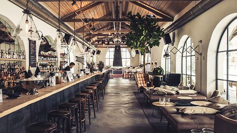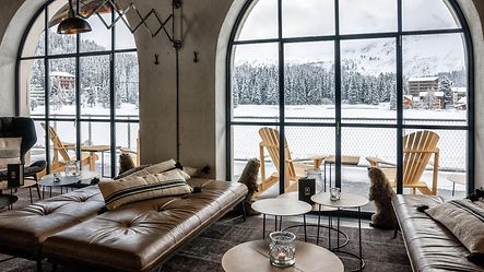 Die Mischung war schnell festgelegt – Alpenzauber sollte auf internationale Inspiration treffen, inklusive Live Unterhaltung. Dafür setzten Bauherren und Innenarchitekten einerseits auf den industriellen Charme des einstigen Güterschuppens, den sie mit einer puristischen Einrichtung noch unterstrichen. Andererseits verstärkten sie die Offenheit des Gebäudes. Mittels riesiger Glasfenster in den ehemaligen Torbögen holten sie die authentische Kulisse von draußen in den Raum hinein. Hoch und hell erscheint der Raum jetzt, in dessen Mittelpunkt eine offene Küche mit Holzkohle-Ofen und eine große Barzeile mit Lounge Bereich angeordnet sind. Rings um den großzügigen Cheminée-Kubus am Ende des Gastraums laden komfortable Sofas zum Entspannen ein. Das Highlight aber ist der Blick aus der Wärme auf die beeindruckende Bergkulisse – möglich gemacht durch ein fünf Meter hohes Rundbogenfenster. Ist das Wetter schön, lädt eine Außenlounge dazu ein, die Atmosphäre am Aroser Obersee an der frischen Luft zu genießen.