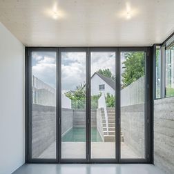 Die Räumlichkeiten im oberen Bereich des Hauses erreicht man über die zentral gelegene, atriumartige Treppe. Die Zimmer können flexibel genutzt werden, z.B. als zusätzliche Studio-Apartments. Im Gebäudesockel befinden sich die Ebenen für das Wohnzimmer und die Küche, sowie ein Schlafbereich mit direktem Zugang nach draußen zum Pool. Die unterste Wohnebene des Hauses liegt zum größten Teil unter der Geländeoberkante. In Verbindung mit den Wänden aus Stampfbeton erzeugt das den Raumcharakter einer Wohnhöhle. Im Gegenzug sorgen große Glasflächen im Erdgeschoss für viel Licht in den Innenräumen.