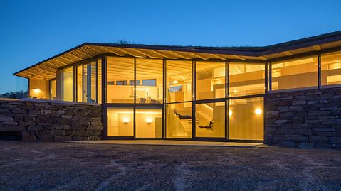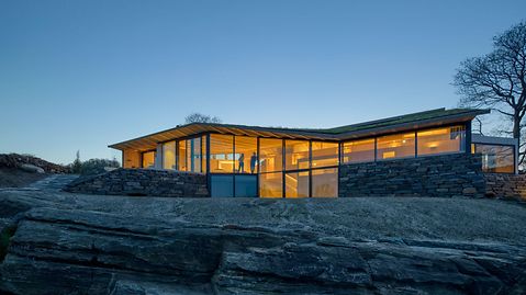Nach über 30 Jahren im Ausland hat sich die Bauherrin Merete mit der Villa Reilstad einen Traum erfüllt: ein Zuhause in ihrem Heimatland Norwegen, inmitten der ursprünglichen Felslandschaft der Insel Finnoy. Das Gebäude sollte sich harmonisch in die Natur einfügen. Deshalb adaptiert die Villa Reilstad die markanten Abstufungen der felsigen Umgebung. Bedeckt von einem geschwungene Dach, weist die Gesamtstruktur des Bauwerks in vier großen Stufen zum Meer hinab. Jede Ebene ist durch eine Terrasse mit der Landschaft verbunden. So wirkt das Haus beinah wie aus dem Gestein herausgewachsen. Aufgrund des starken Gefälles des Grundstücks ruht die Statik des Holzbaus auf einer Betonplatte.