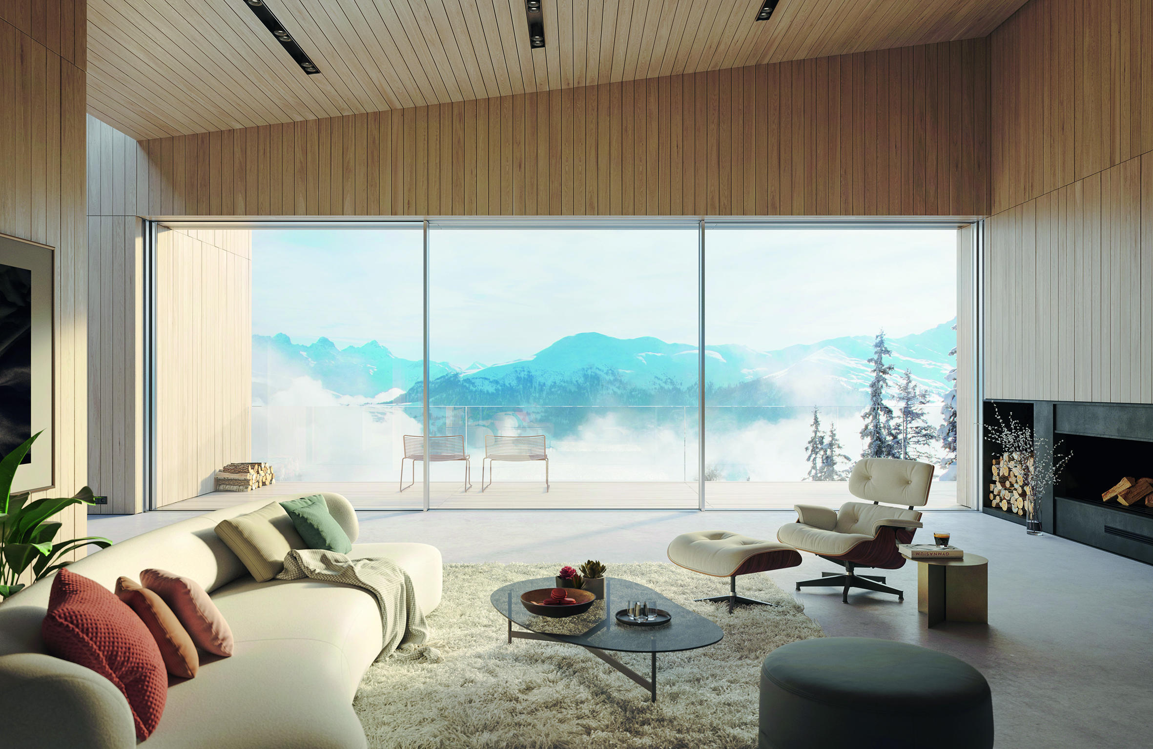 Das Panorama Design Schiebesystem Schüco AS PD 75.HI überzeugt mit einer rahmenlosen Ansicht und einer barrierefreien Schwelle.