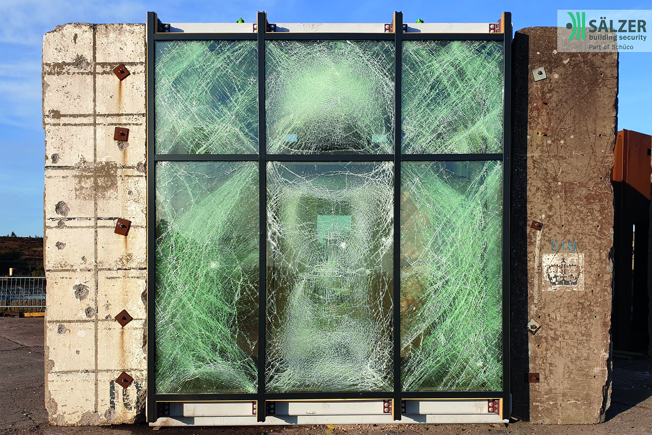 Seit 2018 ist die Sälzer GmbH „part of Schüco“. Sälzer Produkte sind ein- und ausbruchhemmend, durchschusshemmend und sogar sprengwirkungshemmend, wie diese Fassade nach einem Sprengtest mit 500 kg zeigt.